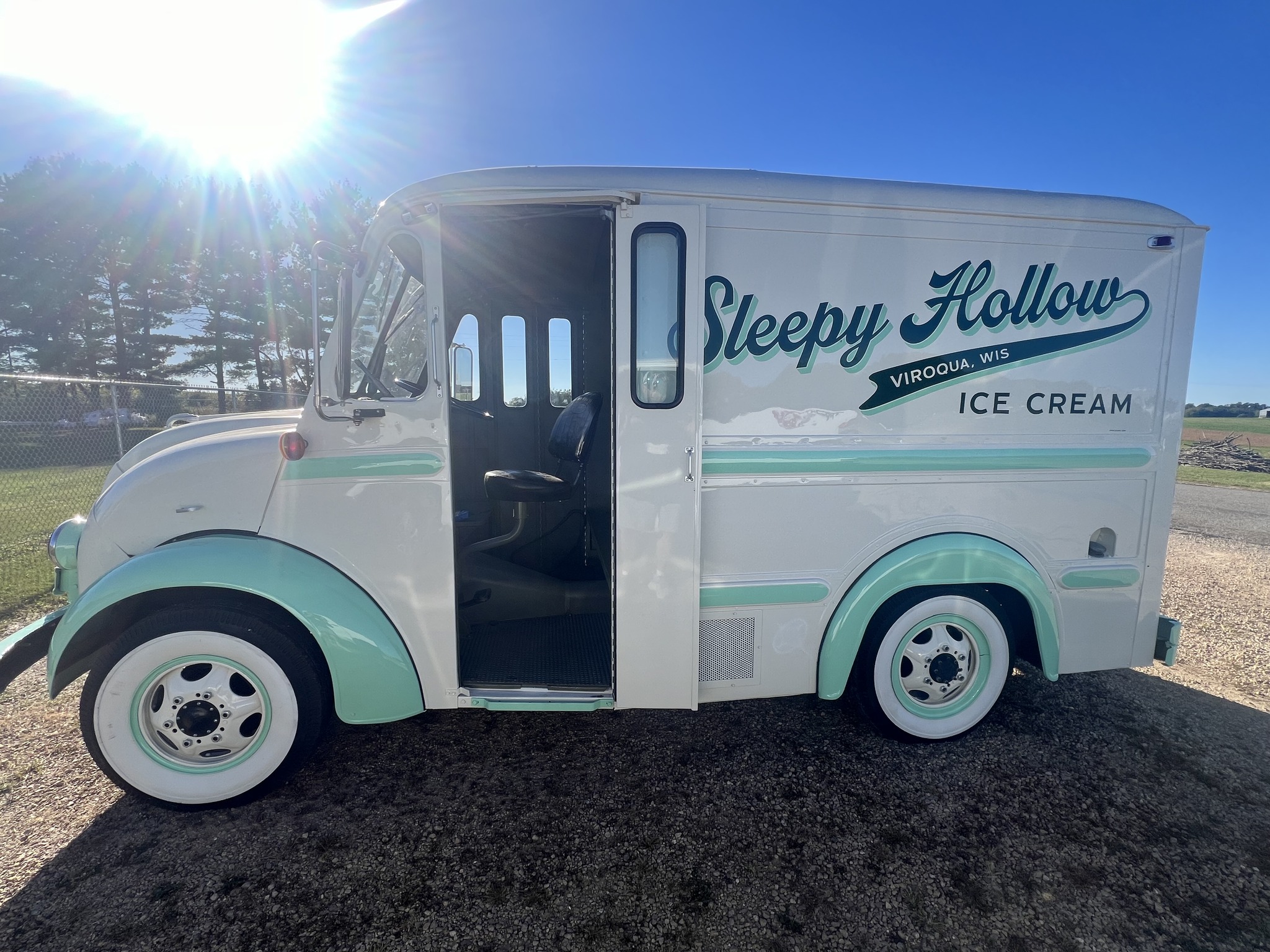 Our expert technicians quickly started restoring it from the inside out; before long, our Collision Center team had cut a hole in the side of the truck, fit a freezer into the back, and painted it creamy vanilla & mint-chip green. They even included a little old bell to ring while we're driving down the road. It made it's big debut at Sleepy Hollow Auto Group's 35th anniversary party in August 2024, and we've been on the road with it ever since!