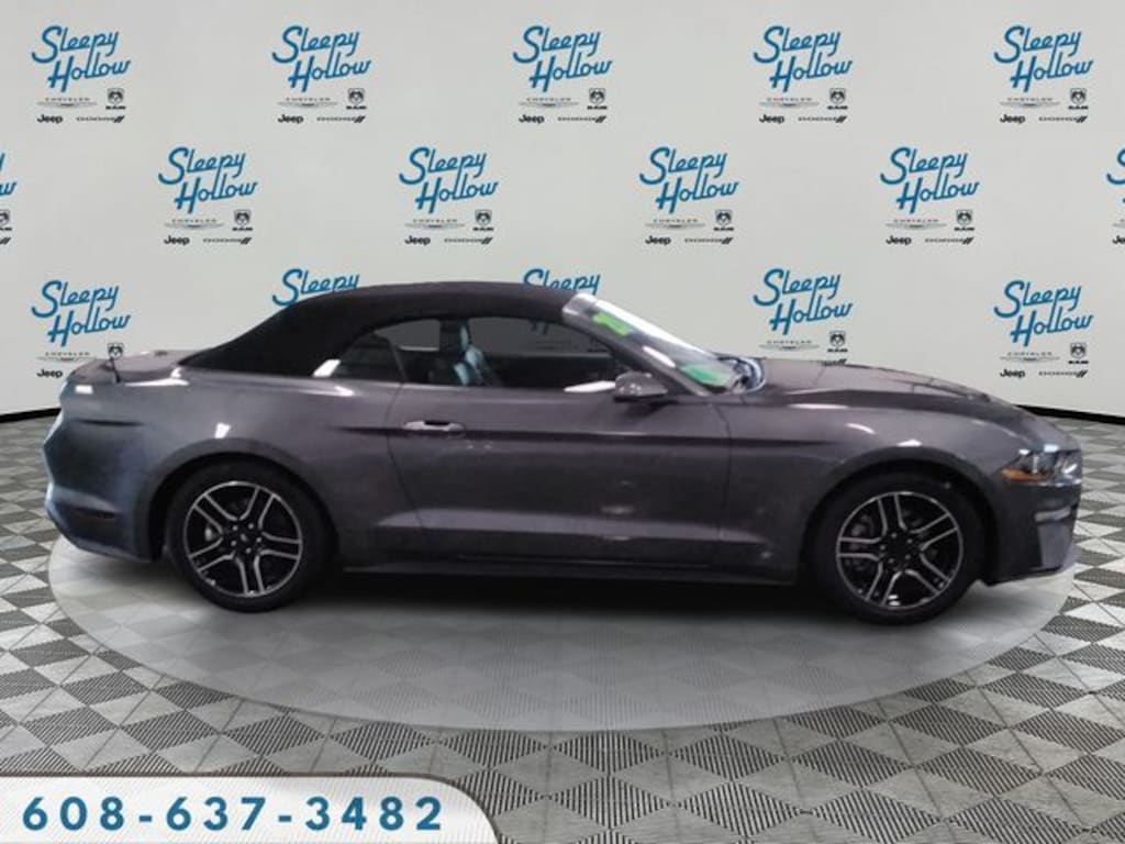 Gray 2021 Ford Mustang RWD 10-Speed Automatic EcoBoost 2.3L I4 GTDi DOHC Turbocharged VCT 4-Wheel Disc Brakes, ABS brakes, Air Conditioning, Alloy wheels, AM/FM Stereo, Auto High-beam Headlights, Auto-dimming Rear-View mirror, Brake assist, Bumpers: body-color, Compass, Convertible roof lining, Delay-off headlights, Driver door bin, Driver vanity mirror, Dual front impact airbags, Dual front side impact airbags, Electronic Stability Control, Emergency communication system: 911 Assist, Exterior Parking Camera Rear, Four wheel independent suspension, Front anti-roll bar, Front Bucket Seats, Front Center Armrest, Front reading lights, Fully automatic headlights, Glass rear window, Illuminated entry, Knee airbag, Leather Shift Knob, Low tire pressure warning, Occupant sensing airbag, Outside temperature display, Overhead console, Panic alarm, Passenger door bin, Passenger vanity mirror, Power convertible roof, Power door mirrors, Power steering, Power windows, Radio data system, Rain sensing wipers, Rear anti-roll bar, Rear window defroster, Remote keyless entry, Security system, SiriusXM Radio, Speed control, Speed-sensing steering, Speed-Sensitive Wipers, Steering wheel mounted audio controls, SYNC 3 Communications & Entertainment System, Tachometer, Telescoping steering wheel, Tilt steering wheel, Traction control, Trip computer, Variably intermittent wipers, Voltmeter, Wheels: 18" x 8" Machined-Face Aluminum.