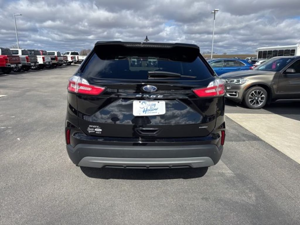 Agate Black Metallic 2024 Ford Edge SEL AWD 8-Speed Automatic EcoBoost 2.0L I4 GTDi DOHC Turbocharged VCT AWD, 110V/150W AC Power Outlet, Convenience Package, Cooler Bag w/Adjustable Carrying Strap, Equipment Group 201A, First Aid Kit, Fog Lamps w/Iconic Silver Bezel, Heated front seats, Heated Steering Wheel, Panoramic Vista Roof, Perimeter Alarm, Power Liftgate, Remote Start System, Roadside Assistance Kit, Universal Garage Door Opener (UGDO), Wheels: 18" Bright-Machined Aluminum, Wireless Charging Pad.