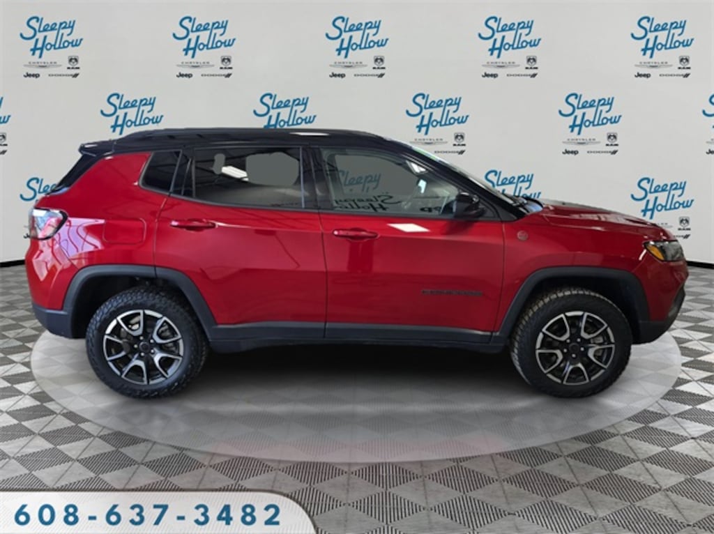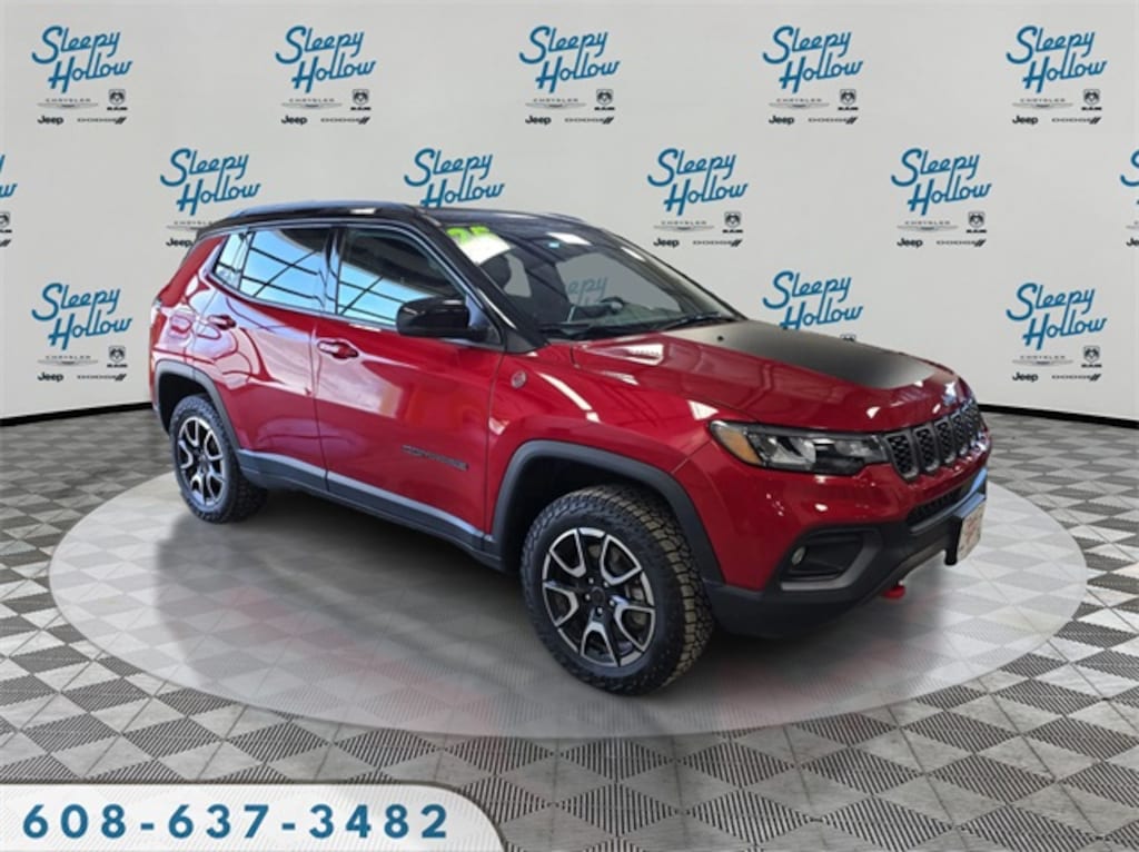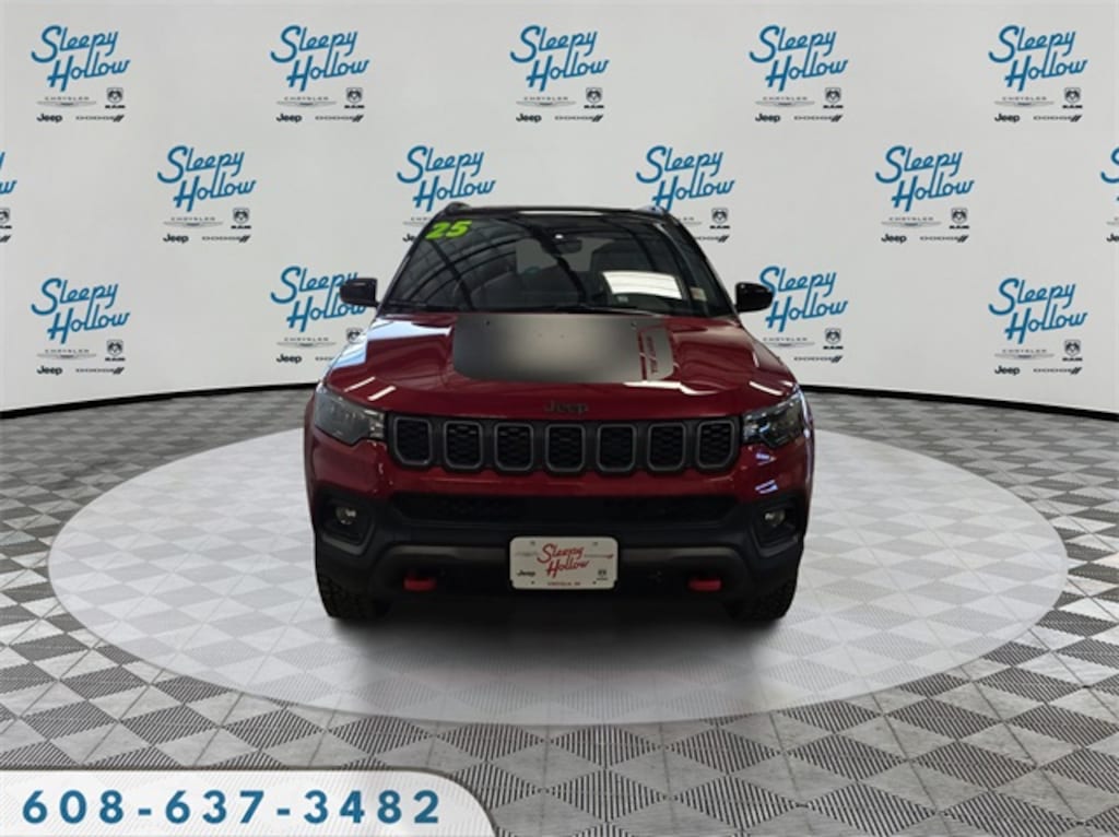 Red Hot Pearlcoat 2025 Jeep Compass Trailhawk 4WD 8-Speed Automatic 2.0L I4 DOHC 4WD, 10.1" Touchscreen Display, 2nd Row USB Type A/C Charge Only, 4 Pin Wiring Harness, 4-Wheel Disc Brakes, 4.398 Final Drive Ratio, 6 Speakers, ABS brakes, Air Conditioning, Alloy wheels, AM/FM radio: SiriusXM, Apple CarPlay/Android Auto, Auto High-beam Headlights, Auto-dimming Rear-View mirror, Automatic temperature control, Brake assist, Bumpers: body-color, Class III Receiver Hitch, Compass, Delay-off headlights, Driver door bin, Driver vanity mirror, Dual front impact airbags, Dual front side impact airbags, Electronic Stability Control, Emergency communication system: Jeep Connect, Four wheel independent suspension, Front anti-roll bar, Front Bucket Seats, Front Center Armrest w/Storage, Front dual zone A/C, Front fog lights, Front reading lights, Fully automatic headlights, Heated door mirrors, Heated Front Seats, Heated Steering Wheel, Illuminated entry, Knee airbag, Leather Shift Knob, Leather steering wheel, Low tire pressure warning, Occupant sensing airbag, Outside temperature display, Overhead airbag, Overhead console, Panic alarm, ParkView Rear Back-Up Camera, Passenger door bin, Passenger vanity mirror, Power 2-Way Driver Lumbar Adjust, Power Adjust 8-Way Driver Seat, Power door mirrors, Power steering, Power windows, Premium audio system: UConnect 5, Premium Cloth/Leather Trim Bucket Seats, Quick Order Package 29E, Radio: Uconnect 5 w/10.1" Display, Rain sensing wipers, Rear anti-roll bar, Rear seat center armrest, Rear window defroster, Rear window wiper, Remote keyless entry, Remote Start System, Reversible Carpet/Vinyl Cargo Mat, Security system, Speed control, Split folding rear seat, Spoiler, Steering wheel mounted audio controls, Tachometer, Telescoping steering wheel, Tilt steering wheel, Traction control, Trailer Tow Group, Trailhawk Convenience Group, Trip computer, Turn signal indicator mirrors, Variably intermittent wipers, Wheels: 17" x 6.5" Painted Black Aluminum, Windshield Wiper De-Icer, 4WD.