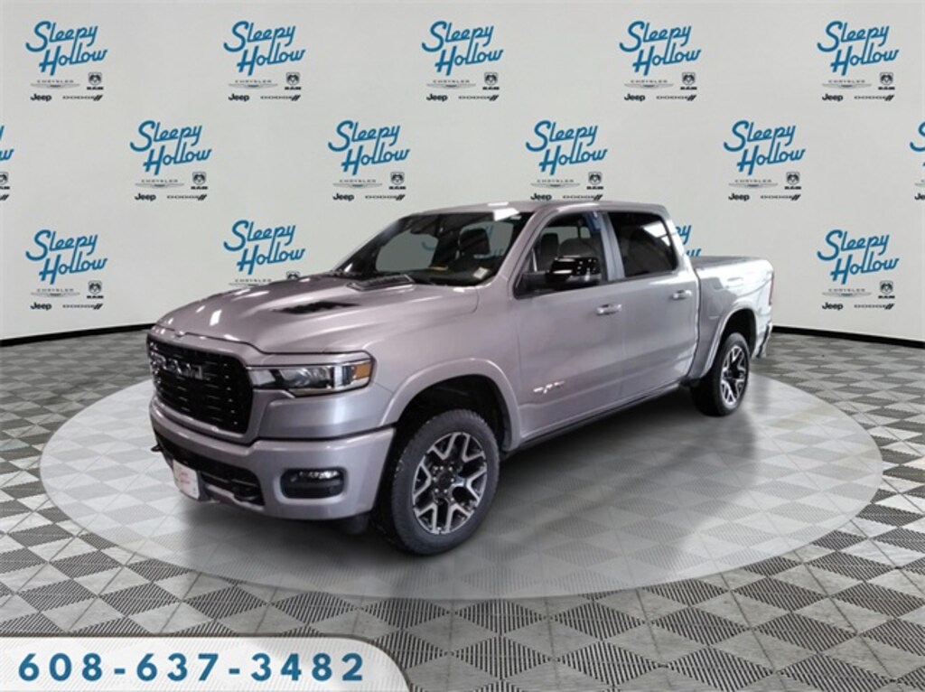 Billet Silver Metallic Clearcoat 2026 Ram 1500 Laramie 4WD 8-Speed Automatic 3.0L I6 10 Speakers, 14.4" Touchscreen Display, 4-Wheel Disc Brakes, 4G LTE Wi-Fi Hot Spot, ABS brakes, Accent Color Premium Power Mirrors, Active Noise Control System, Adjustable pedals, Air Conditioning, Alloy wheels, AM/FM radio: SiriusXM with 360L, Apple CarPlay/Android Auto, Audio memory, Auto High-beam Headlights, Auto Power-Folding Mirrors, Auto-dimming door mirrors, Auto-Dimming Exterior Driver Mirror, Auto-dimming Rear-View mirror, Automatic temperature control, Bed Utility Group, Black Interior Accents, Black Painted Exterior Mirrors Caps, Body Color Front Bumper, Body Color Rear Bumper with Step Pads, Brake assist, Bridgestone Brand Tires, Bumpers: chrome, Chrome Exterior Mirrors, Cluster 12" TFT Color Display, Compass, Connected Travel and Traffic Services, Connectivity - US/Canada, Convex Wide-Angle Exterior Mirror Insert, Delay-off headlights, Dome Dual LED Reading Lamp, Driver door bin, Driver vanity mirror, Dual front impact airbags, Dual front side impact airbags, Dual-Pane Panoramic Sunroof, E-Locker Rear Axle, Electronic Stability Control, Exterior 115V AC Outlet, Exterior Mirrors Courtesy Lamps, Exterior Mirrors with Heating Element, Exterior Mirrors with Memory, Exterior Mirrors with Supplemental Signals, Falken Brand Tires, Front anti-roll bar, Front Bucket Seats, Front Center Armrest w/Storage, Front dual zone A/C, Front Extra Heavy Duty Shock Absorbers, Front fog lights, Front License Plate Bracket, Front Passenger Interactive Display, Front reading lights, Front wheel independent suspension, Fully automatic headlights, Garage door transmitter, GPS Navigation, Grille Surround 3 Body Color Tex 2 Black, Harman/Kardon 19 Speaker Premium Sound, Heated door mirrors, Heated front seats, Heated rear seats, Heated steering wheel, Illuminated entry, Integrated Center Stack Radio, Integrated Voice Command with Bluetooth, Laramie Level 2 Equipment Group, Leather steering wheel, Leather Trimmed Bucket Seats, LED Dome/Reading Lamp, Low tire pressure warning, Memory seat, MOPAR 4 Adjustable Cargo Tie-Down Hooks, MOPAR Front and Rear Rubber Floor Mats, MOPAR Spray in Bedliner, Navigation System, Occupant sensing airbag, Off Road Decals, Off Road Group, Off-Road Information Pages, Outside temperature display, Overhead airbag, Overhead console, Panic alarm, ParkView Rear Back-Up Camera, Passenger door bin, Passenger vanity mirror, Pedal memory, Power Deployable Running Boards, Power door mirrors, Power driver seat, Power passenger seat, Power steering, Power Tailgate, Power windows, Quick Order Package 21H Laramie, Radio data system, Radio: Uconnect 5 Nav with 14.4" Display, Radio: Uconnect 5 Navigation with 12.0" Display, Rain Sensitive Windshield Wipers, Raised Ride Height, RAM Grille Badge - Chrome, RamBox Cargo Management System, Rear anti-roll bar, Rear Extra Heavy Duty Shock Absorbers, Rear reading lights, Rear seat center armrest, Rear step bumper, Remote keyless entry, Security system, Selec-Speed Control, SiriusXM Radio Service, SiriusXM with 360L, Speed control, Split folding rear seat, Sport Appearance Package, Sport Performance Hood, Steering wheel mounted audio controls, Tachometer, Telescoping steering wheel, Tilt steering wheel, Tow Hooks, Traction control, Trailer Brake Control, Trip computer, Turn signal indicator mirrors, USB Host Flip, Variably intermittent wipers, Ventilated front seats, Voltmeter, Wheels: 20" x 9" Premium Paint/Polish.
